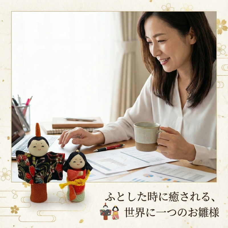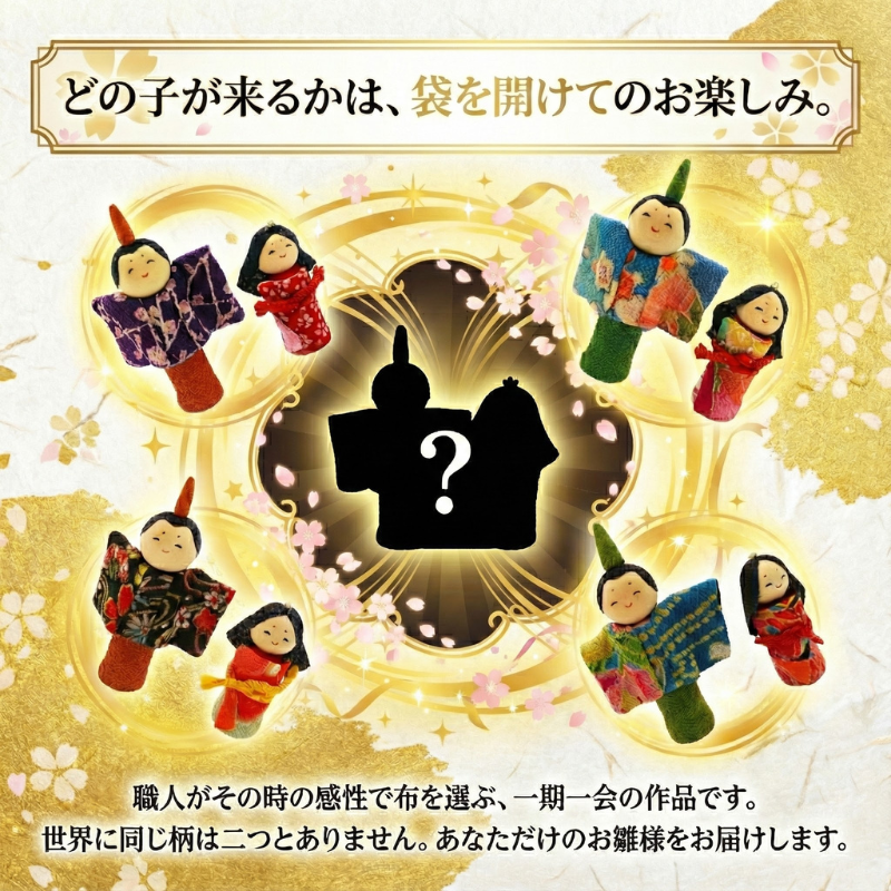 本商品は、職人がその時々の感性で着物生地を選び手作りしています。そのため、お届けする人形の着物柄は写真とは異なり、世界に一つだけのデザインとなります。「どんな柄が届くか」という出会いをお楽しみください。