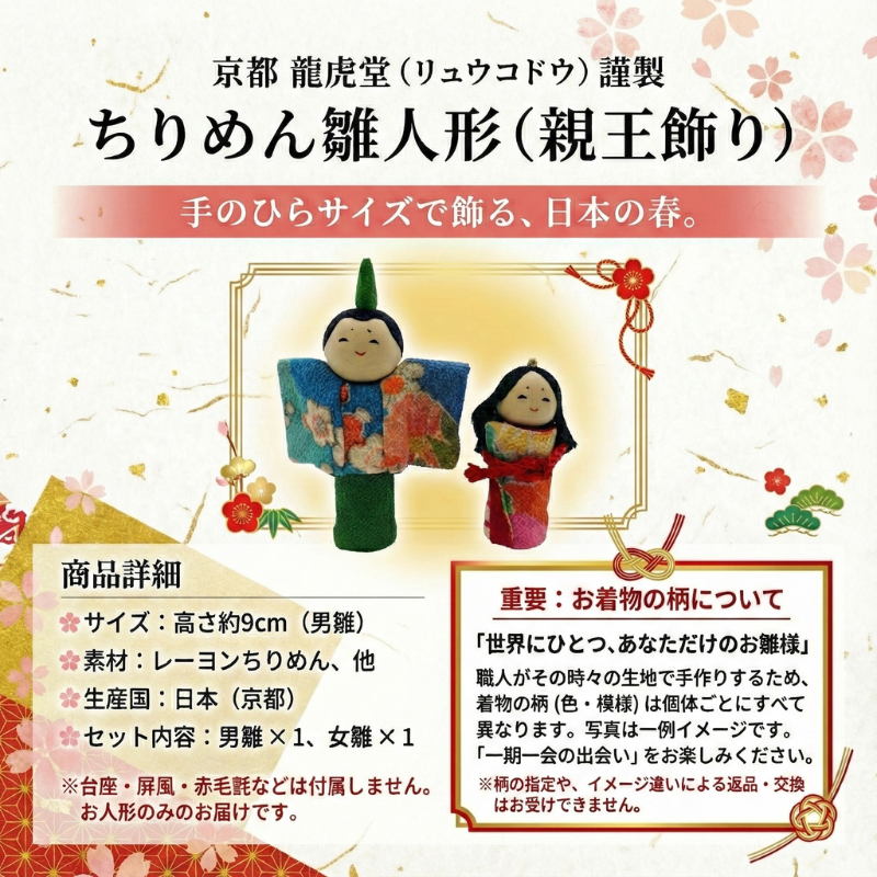ブランド:龍虎堂(リュウコドウ) サイズ:高さ 約9cm(男雛) 素材:レーヨンちりめん 他 生産国:日本(京都) セット内容:男雛 女雛 ※台座や屏風は付属しません。