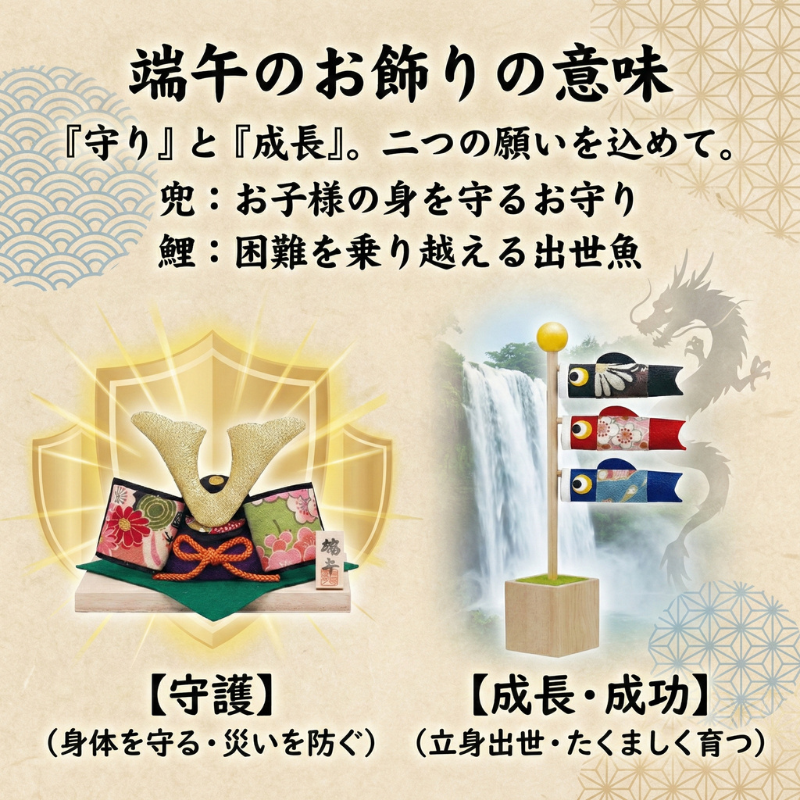 ◆兜と鯉のぼりの両方が楽しめる 男の子の身を守る「兜」と、立身出世を願う「鯉のぼり」。 端午の節句に欠かせない二つの飾りがセットになりました。