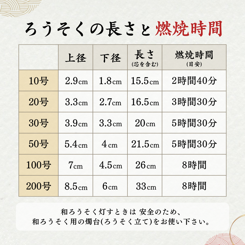 一本一本手作りされる筒状和紙と灯芯、そして植物性(櫨、ヤシ)原料により、力強く明るい炎と、油煙を抑えたクリーンな燃焼を実現。約8時間という長時間燃焼は、長丁場の儀式でも安心してお使いいただけます。