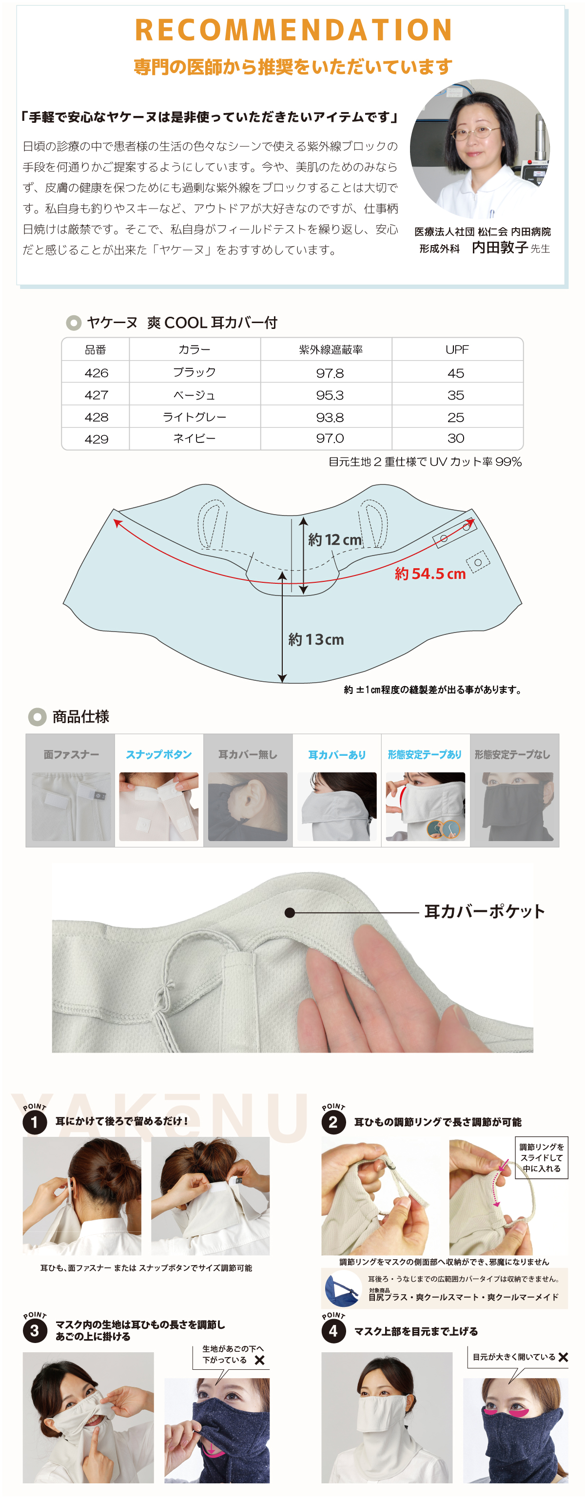 | 品名 | 日焼け対策専用UVカットフェイスカバー ヤケーヌ 爽クール 耳カバー付 |