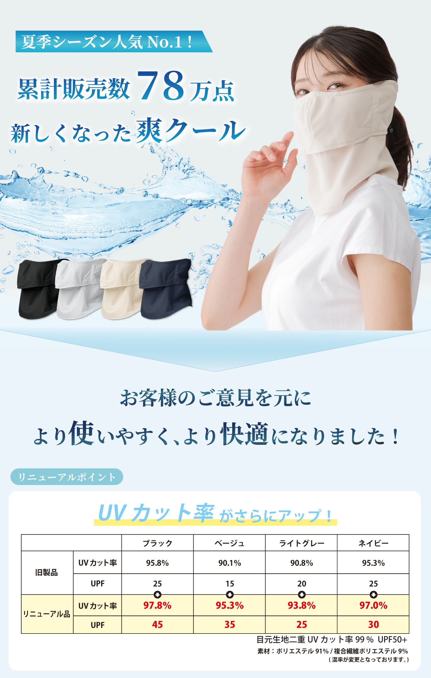 | 素材 | ・ポリエステル:100% ※素材そのものが紫外線カットするので洗濯してもUVカット率は変わりません UVカット:紫外線遮蔽率 93.8%〜97.8%、UPF 45〜20 目元は二重生地構造でUVカット率99% 伸縮性能:日本製ニット生地は良く伸び破れにくい 吸汗速乾:汗の吸水性が良く、すぐに乾きます 高通気性:通気性が高いので蒸れにくく快適 国内生地:ヤケーヌは日本製生地使って日系ベトナム工場で縫製しています。 |