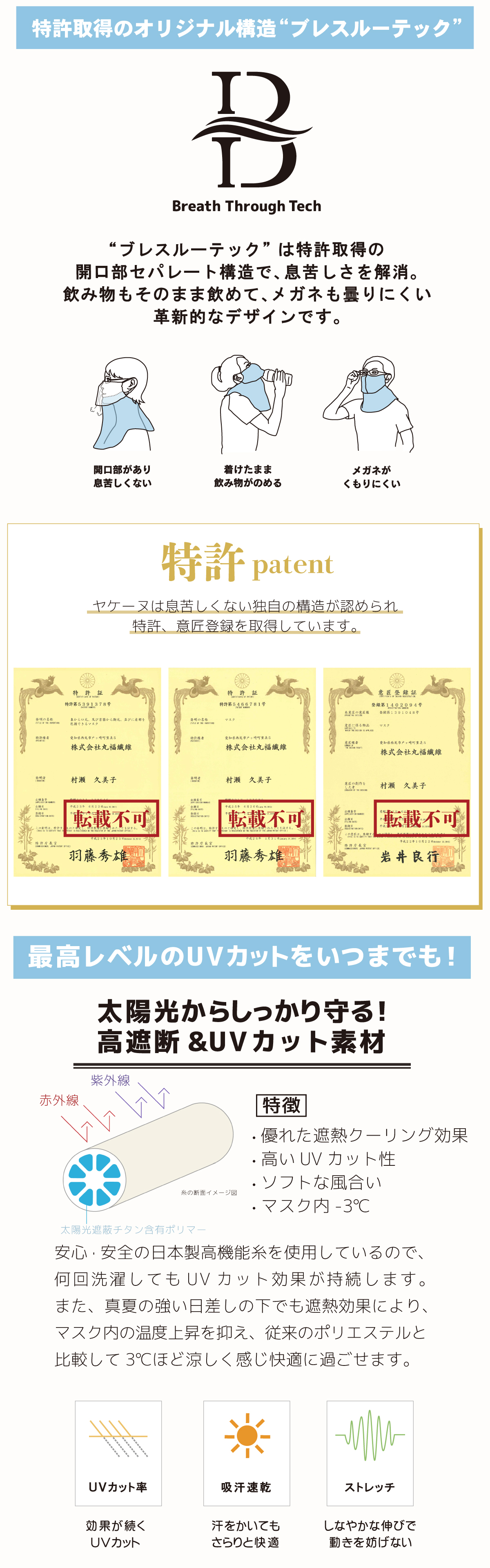 | 企画販売元 | UVカットフェイスカバー ヤケーヌは、愛知県西尾市にある株式会社丸福繊維が独自開発し特許を取得した2010年から販売しているオリジナル商品です。 |