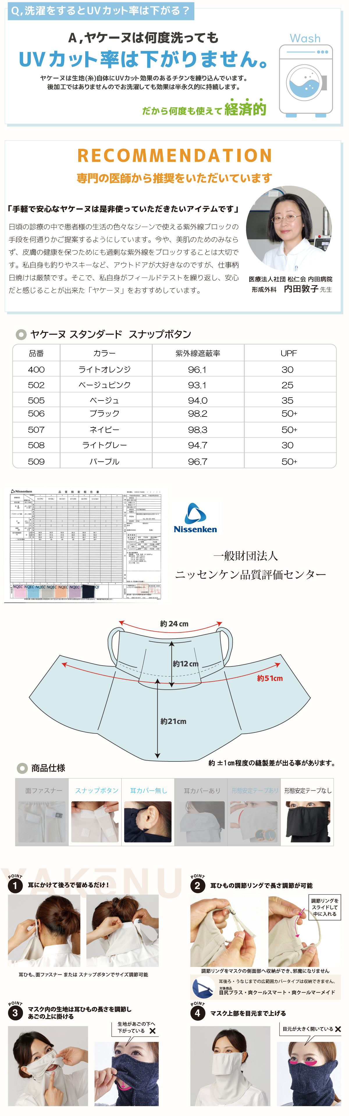 | 品名 | 紫外線対策専用UVカットフェイスマスク ヤケーヌスタンダード(スナップ式) |