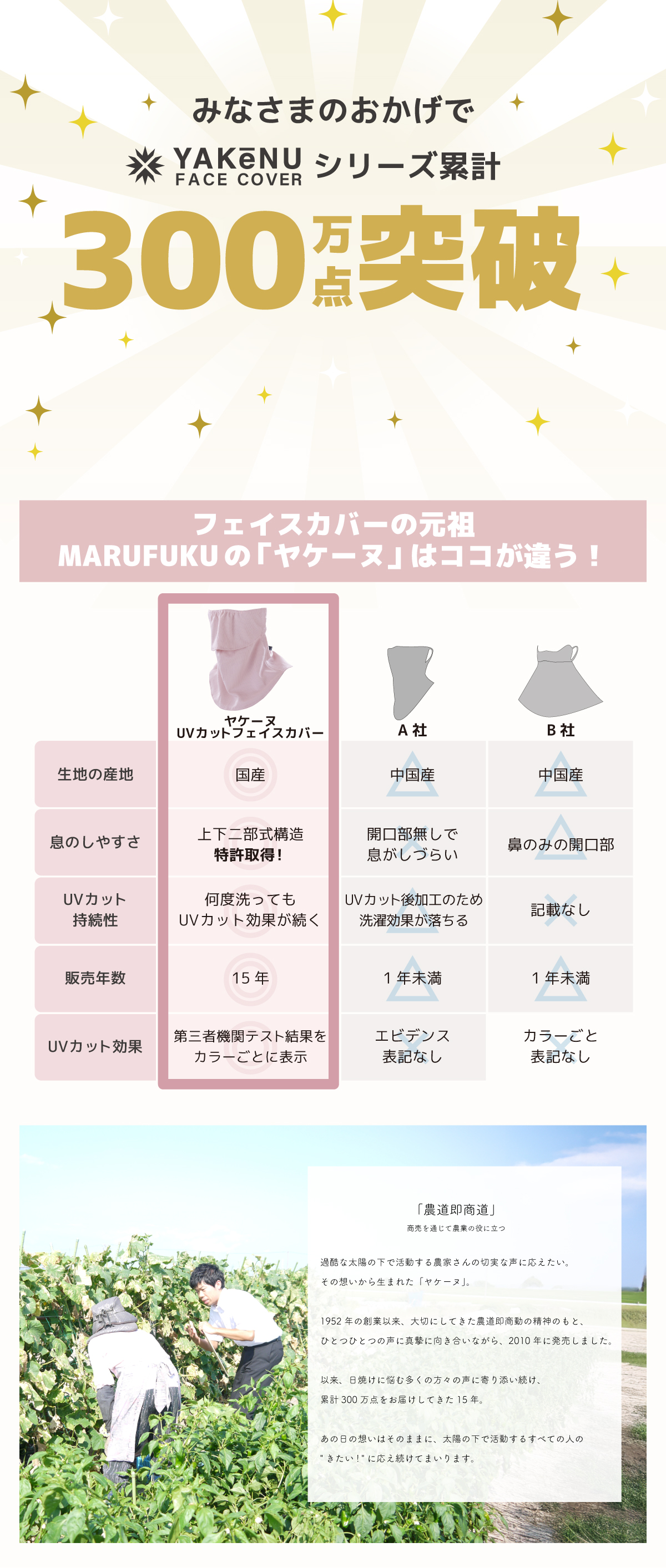 | 企画販売元 | UVカットフェイスカバー ヤケーヌは、愛知県西尾市にある株式会社丸福繊維が独自開発し特許を取得した2010年から販売しているオリジナル商品です。 |