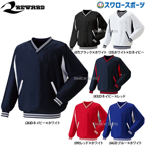 ●商品名:レワード 長袖 Vネック プルオーバーコート Vジャン GW-20 野球用品 スワロースポーツ★マーキングはイメージです。●素材/表:ダイヤモンドタフタ、裏:トリコット起毛●サイズ:S、M、L、O、XO、2XO●カラー:(07)ブラック×ホワイト、(35)ホワイト×Dネイビー、(83)Dネイビー×レッド、(26)Dネイビー×ホワイト、(09)レッド×ホワイト、(66)Dブルー×ホワイト軽量・撥水・透湿性に優れたダイヤモンドタフタを採用プレイヤーの動きを強力サポートポケットは物が落ちにくい逆玉仕様