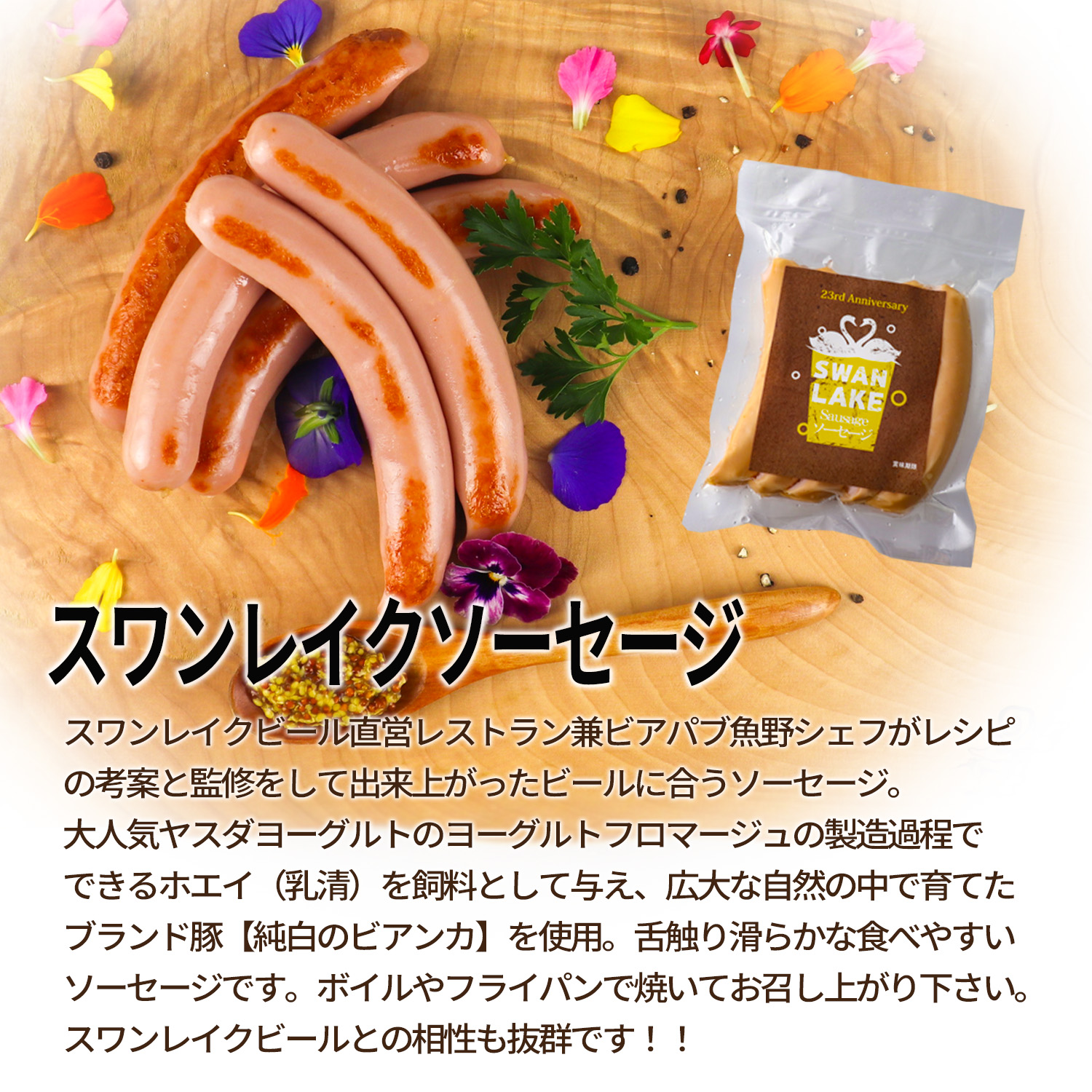 | 原材料 | スワンレイクソーセージ:豚肉・食塩・糖類(砂糖、水あめ)・植物性たん白・香辛料、リン酸塩(Na)・調味料(アミノ酸等)・保存料(ソルビン酸K)・酸化防止剤(ビタミンC)・発色剤(亜鉛酸Na)(一部の大豆含む) |