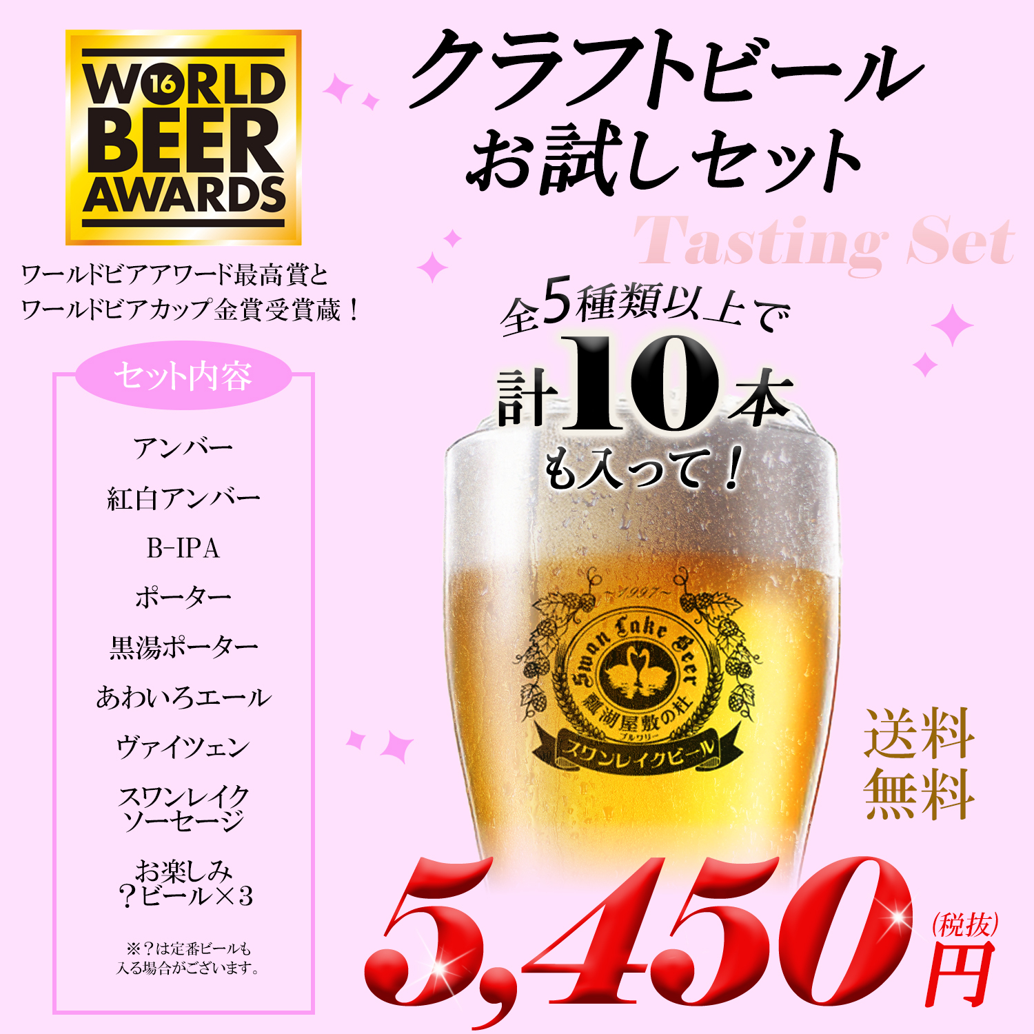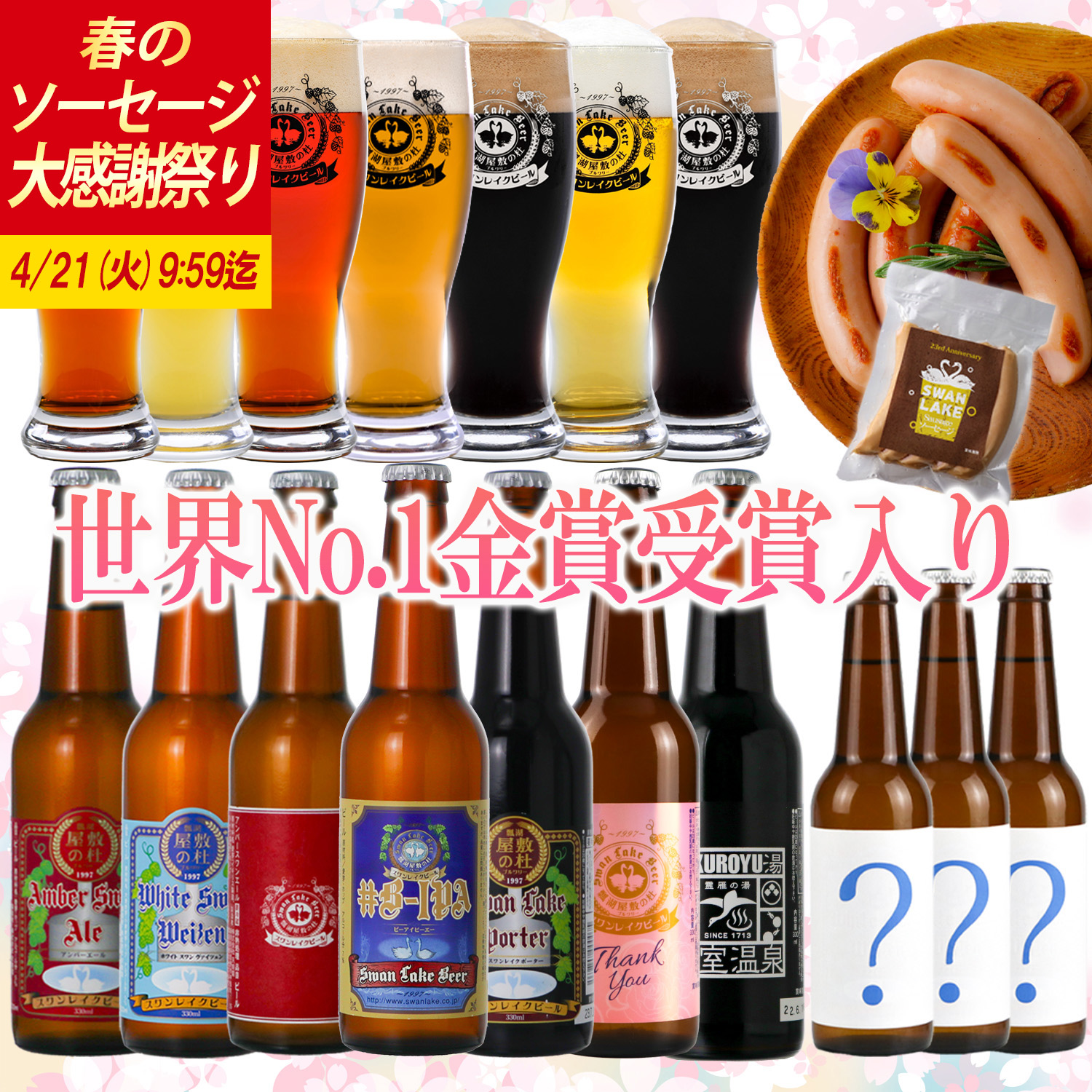 | 内容量 | B-IPA 330ml×1本 ポーター 330ml×1本 アンバー 330ml×1本 黒湯ポーター 330ml×1本 ヴァイツェン 330ml×1本 あわいろエール 330ml×1本 紅アンバー330ml×1本 ??(シークレットボトル) 330ml×3本 スワンレイクソーセージ 約175g(約35g×5本)1個 |