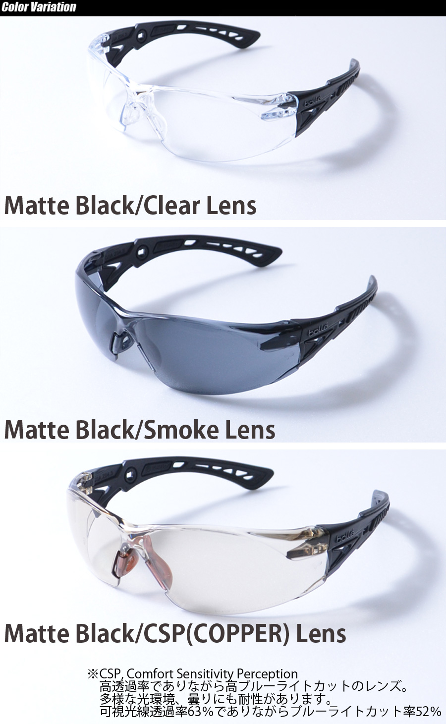Bolleのフラッグシップモデル「RUSH+」をベースにマットブラックフレームを採用したモデル。一体成型テンプルにより優れたフィット感とホールド感、調整可能ノーズピースなどの機能性や優れた耐久性が好評です。高ブルーライトカットの「CSP」レンズモデルも展開。