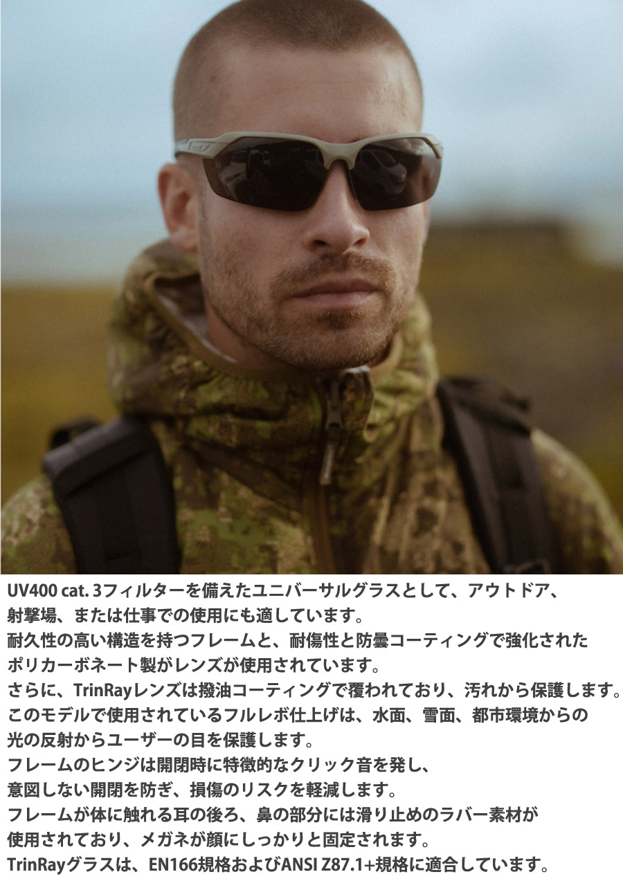 EN 166 :ヨーロッパの保護規格EN 166に適合。撥水・撥油コーティング:埃、油、汚れの付着を防ぐ撥油層と水分子をはじく撥水層コーティング。UVA/UVB 保護レンズ:有害な太陽光線から目を保護するUVA/UVBフィルターを備えたレンズを使用しています。耐傷・防曇性:傷や曇りを防ぐ耐傷・防曇性コーティング。耐衝撃性:耐衝撃性に富んだ、ポリカーボネート製レンズ。SNAP &CLICK:フレームのヒンジ部分の特殊構造により、指一本で開閉が可能。意図しない開閉を防ぐクリック音。