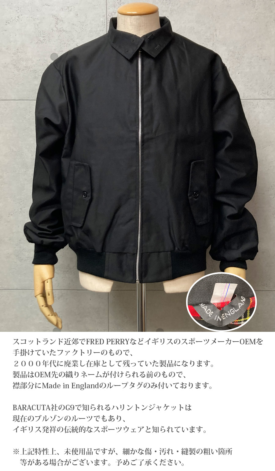 スコットランド近郊でFRED PERRYなどイギリスのスポーツメーカーOEMを手掛けていたファクトリーのもので、2000年代に廃業し在庫として残っていた製品になります。製品はOEM先の織りネームが付けられる前のもので、襟部分にMade in Englandのループタグのみ付いております。BARACUTA社のG9で知られるハリントンジャケットは現在のブルゾンのルーツでもあり、イギリス発祥の伝統的なスポーツウェアと知られています。裏地は全カラー共通で赤のチェック柄となります。※上記特性上、未使用品ですが、細かな傷・汚れ・縫製の粗い箇所等がある場合がございます。予めご了承ください。