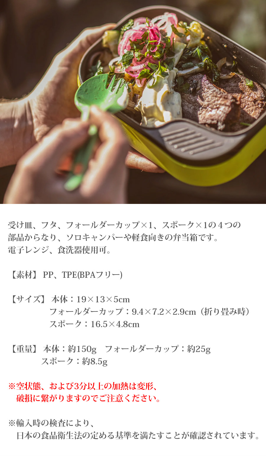 ウィルドゥのキャンプボックスライトは、受け皿、フタ、フォールダーカップ×1、スポーク×1の4つの部品からなり、ソロキャンパーや軽食向きの弁当箱です。電子レンジ、食洗器使用可。ただし空状態および3分以上の加熱は変形、破損に繋がりますのでご注意ください。