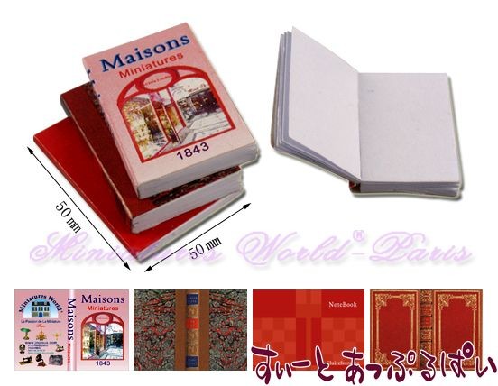 ちょっと高いですが・・今までにない、ビンテージな感じの本4冊セットです。1冊はノートブックと書いてあります。中身は白紙のページが入っています。作れる方は、これを参考に作ってみてください。サイズ:15x23mm、厚み約3mm、一番小さな本:12x18mm、厚み約2mm、ノート:16x23mm、厚み約1.5mm