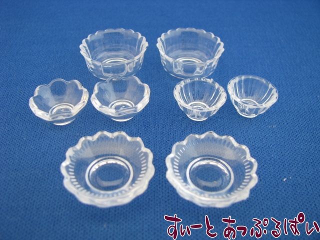 お皿1枚あたりは110円です!プラスチック製ですが、透明度も高いです。深さのある小鉢もうれしいですよね!多少バリがありますが、ご了承くださいませ…たくさん揃えたい貴方に!一番手前のお皿:直径約20mm、高さ5mm、中央左の小鉢:直径15mm、高さ7mm、中央右の小鉢:直径14mm、高さ8mm、一番奥の小鉢:直径20mm、高さ10mm
