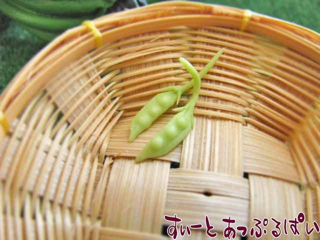 かわいいさやえんどうのミニチュア、2個セットです!サイズ:約10ミリ(ヘタの部分を除く)。