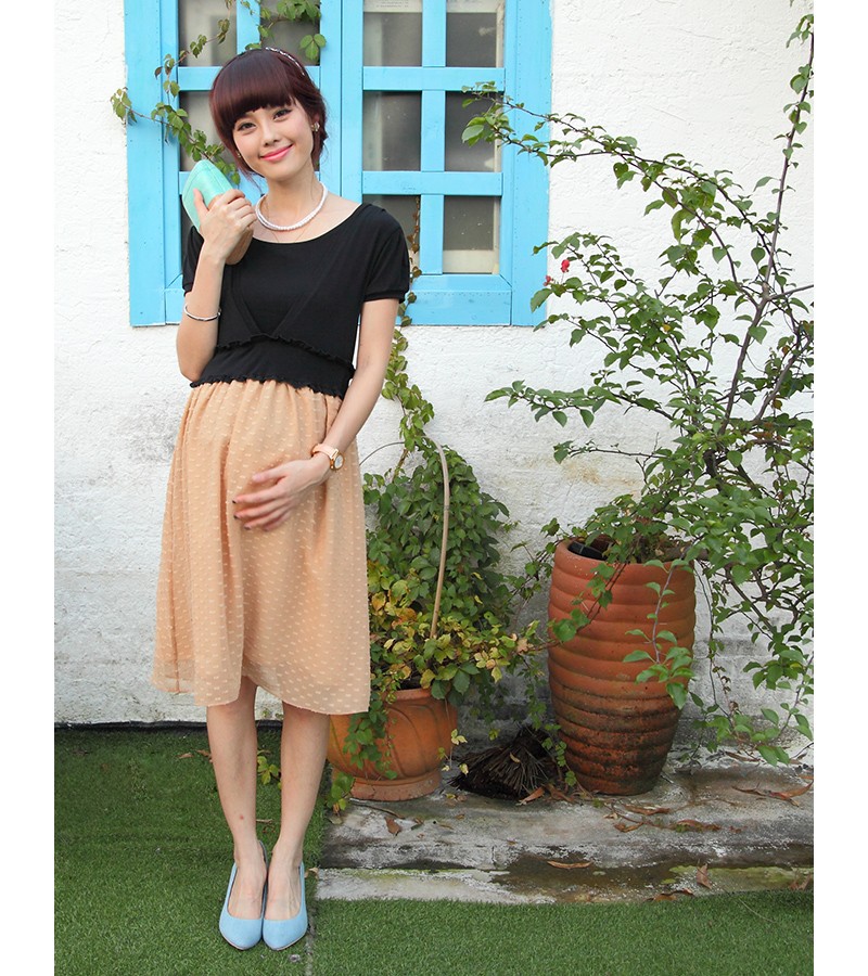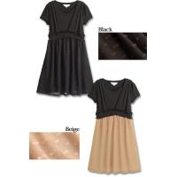コンパクトできちんと感のあるエステル素材のトップスに、涼しげな透け感と立体的で存在感のあるドビー織りの替わりシフォンがふんわりと好バランスなお出かけワンピースです。 品の良い配色と高級感のある異素材MIXを程よく効かせた上品な表情が魅力。キュッと絞ってメリハリを出す着やせ効果抜群のウエスト切り替えにはミニフリルがキュート! お出かけやお食事などにも、おしゃれ感たっぷり。 上品でガーリーなお出かけスタイルを演出。授乳しやすいのに、授乳服っぽさを感じさせない、おしゃれママ必見のワンピースです。