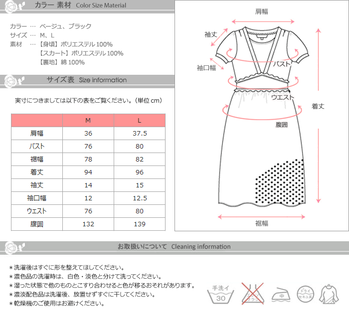 サイズ(cm):M(着丈94,バスト76,腹囲132、肩幅36,袖丈14,ウエスト76)L(96,80,136,37.5,15,80)