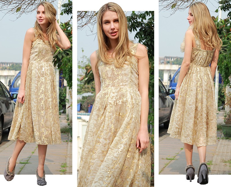 箔プリントのシフォンは動くたびに煌くラメがエレガント。
