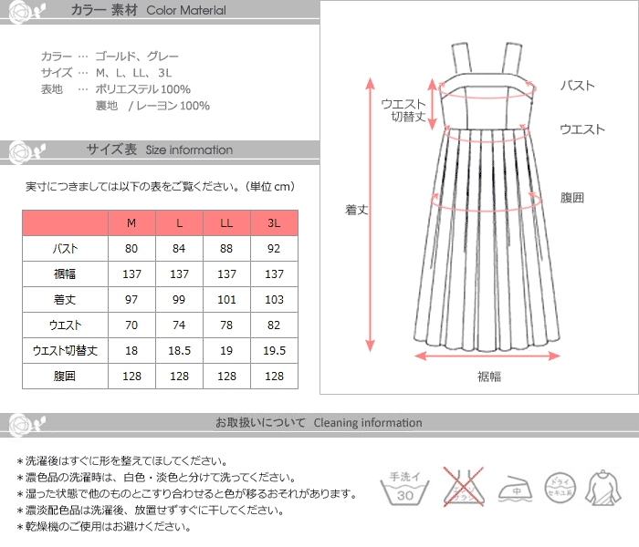 サイズ(cm):M(バスト80,裾幅137,着丈97,ウエスト70,ウエスト切替丈18,腹囲128)L(84,137,99,74,18.5,128),LL(88,137,101,78,19,128),LL(92,137,103,82,19.5,128)