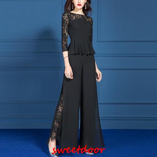 パンツドレス かっこいい セットアップ レディース パーティードレス 結婚式 服装 女性 お呼ばれドレス 袖あり 黒 ペプラムトップス 長袖 七分袖 大きいサイズ 3L 4L ドレス パンツ ワイドパンツ ウエストマーク スタイルアップ スタイリッシュ シースルー シアー レース 20代 30代 40代 おしゃれ 上品 きれいめ