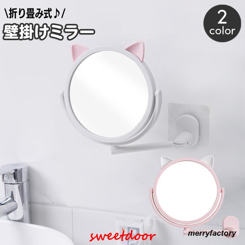 壁掛け鏡 ウォールミラー 可動式 折り畳み スイングミラー アームミラー ネコ 猫耳 丸型 ラウンド インテリア 収納 日用品雑貨 おしゃれ かわいい