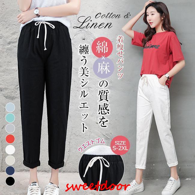 テーパードパンツ 綿麻 新作 薄手 九分丈 ズボン レディース リネン 大きいサイズ ゆったり ウエストゴム ポケット付き