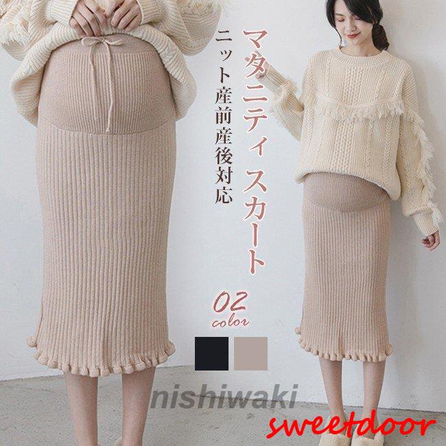 マタニティ タイトスカート リブニット ロング 裾フリル バックスリット ストレッチ リボン アジャスター 厚手 秋冬 産前産後バレンタインデー