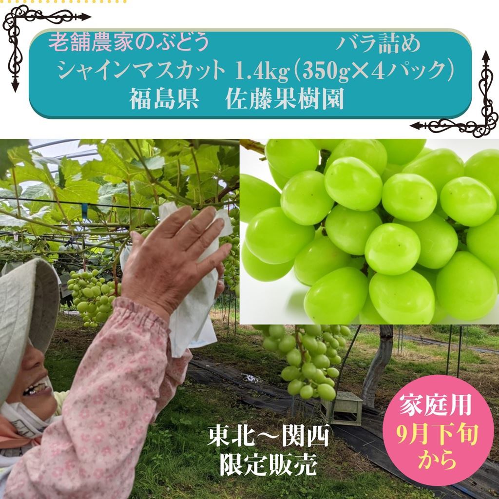 【佐藤果樹園】 シャインマスカット1.4kg(350g×4パック) 種なしぶどう 家庭用バラ詰 福島県 翌日配送地区限定発売