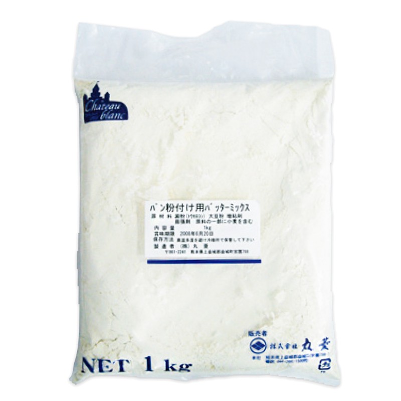 | 使用方法 | 1.冷水500〜600ccにミックスを100g入れ均一になるよう混ぜバッター液を作ります。(攪拌時間2〜3分) 2.バッター液に生地を潜らせ余分な液を手で払います。 3.パン粉付けをして下さい。 4.揚げます。 |