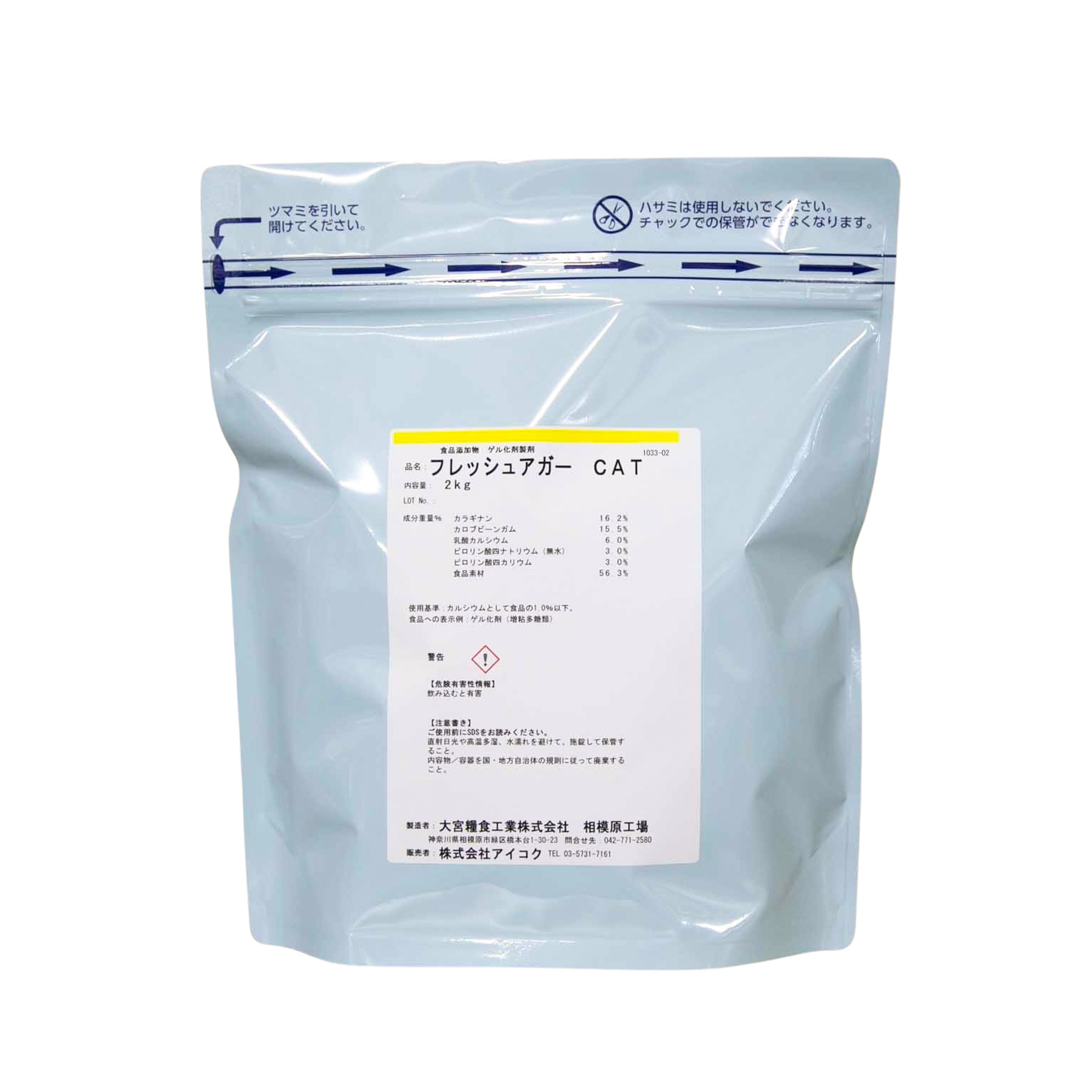 | 概要 | 特徴 耐熱性に優れており、つるっとしたやわらかい食感のゲル化剤です。 透明性が高く多少離水し、型離れもよくジューシー感がでるのでフルーツゼリーやワインゼリーなどにおすすめのアイテムです。 使用量は全体の1.1~1.5%が目安になります。 使用方法 1.アイコクフレッシュアガーCATとグラニュー糖は良く混ぜ合わせておく。 2. ボール又は容器に水を計り入れ、強く攪拌しながらダマにならに様に(1)を振り入れる。(この時、果汁や酸味料など酸性のものは混ぜて湯せんにかけ、60℃位に温めておく) 3. 加熱を始め、90℃以上で完全にゲル化剤が溶解したら火を止める。 4. あらかじめ湯せんしておいた果汁及び洋酒などを加え均一に混ぜ合わせる。 5. 仕上り重量が100になるように熱湯で重量補正し、均一に混ぜ合わせる。 6. 容器に充填し、湯殺菌(85℃、20 分)を行う。 7. 素早く冷却する。※チルドの商品は(6)の湯殺菌の行程が省略されます。その際はフレッシュアガーCATの添加量を1~2 割り程度減らして調整して下さい。 製法上の注意 ・アイコクフレッシュアガーCATとグラニュー糖は必ず良く混合してからご使用下さい。 ・果汁など酸性の材料や洋酒は、ゲル化剤を完全に溶解後、火を止めてから加えて下さい。 ・果汁などに完全に溶解してご使用ください。 ・殺菌条件は、仕込量・容器の大きさなどで変わります。 ・仕込量が10kgを越えるとゼリーがやや柔らかくなることがありますので、その場合はゲル化剤を1割程度増やして下さい。 ・ゼリーの硬さや食感は、アイコクフレッシュアガーCATの添加量で調整して下さい。 主な用途 製菓、製パン全般でご使用いただけます。 |