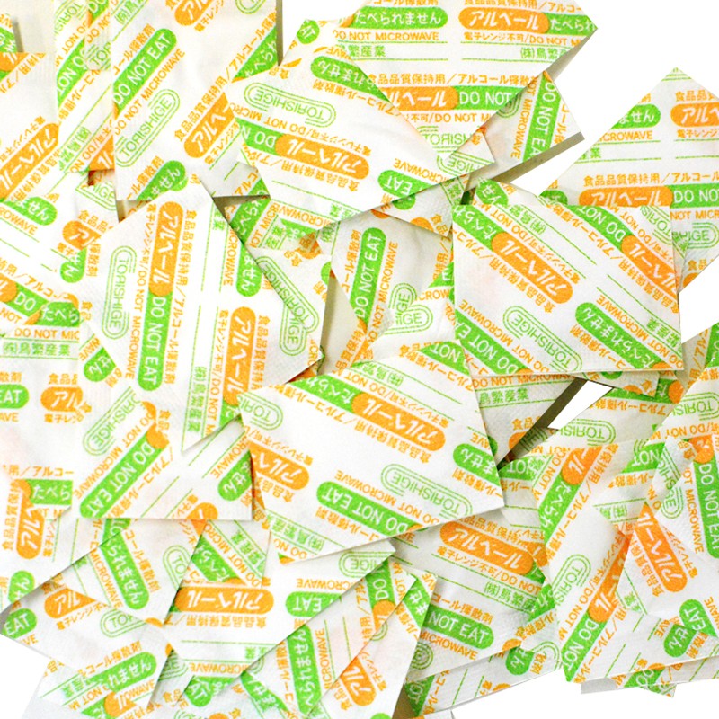 エタノール揮散剤「アルベール」は,食品包装容器内でエチルアルコールを揮散させて食品のカビ発生を防ぐ品質保持剤です。