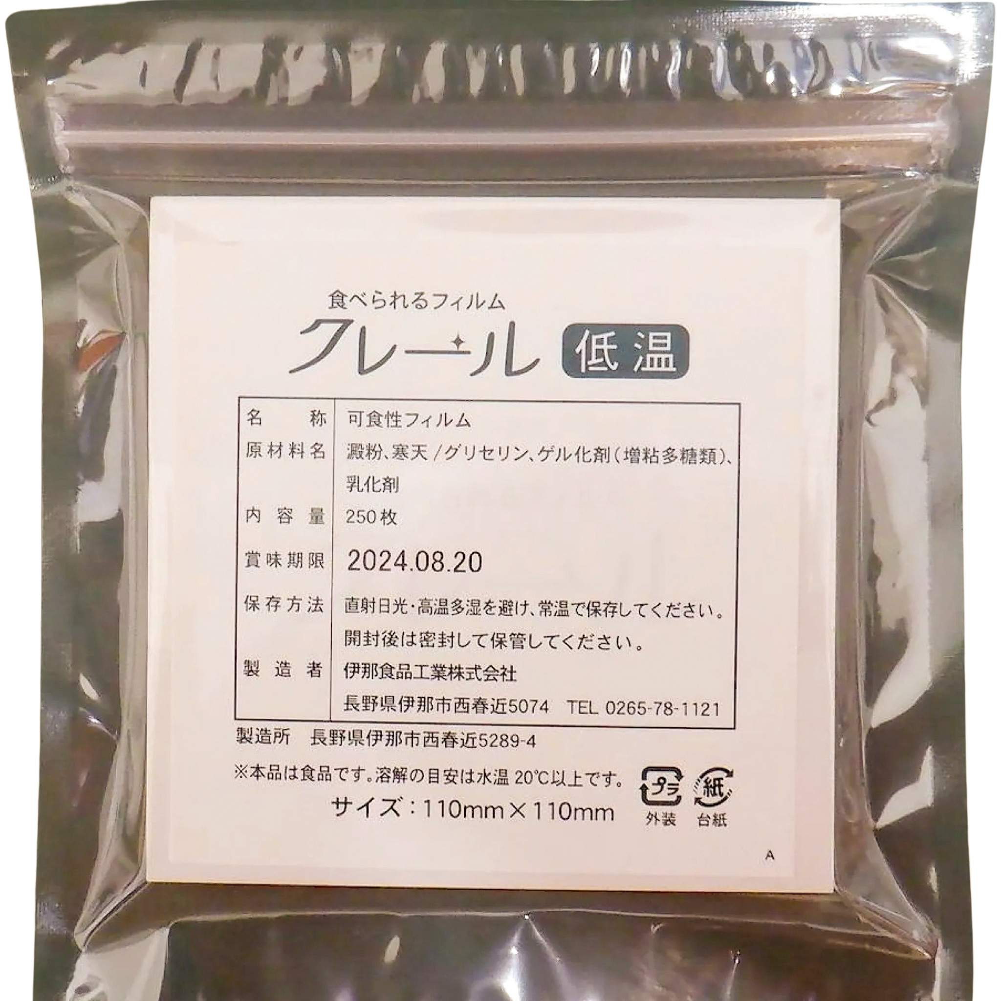 | 概要 | 特徴 20℃以上で溶ける、食べられるエコフィルムです。生フルーツタルトなど、フレッシュフルーツからパイ生地への水分移行を防ぐ用途に最適です。溶けても無味無臭のため、料理に影響が出にくいアイテムです。 使用例 生フルーツタルト (焼成後のパイ生地と生フルーツとの水分移行を防止) 使用上の注意 製造諸条件 (具材の糖度、水分値、pH値)により溶解温度に差が生じますので、溶解温度につきましては目安温度としてご認識ください。 主な用途 製菓、製パン全般でご使用いただけます。 |