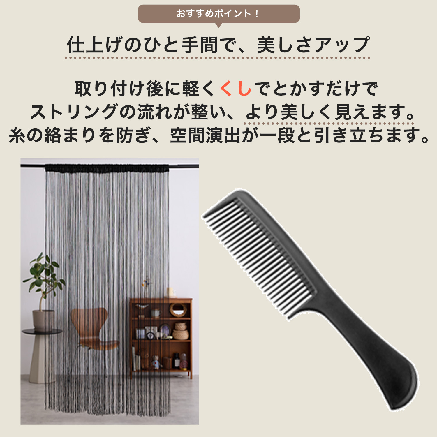 【ストリングカーテン(フリンジ・ひものれん)】は、開放的な空間を作り日の光を優しく遮りプライベートを作ります。