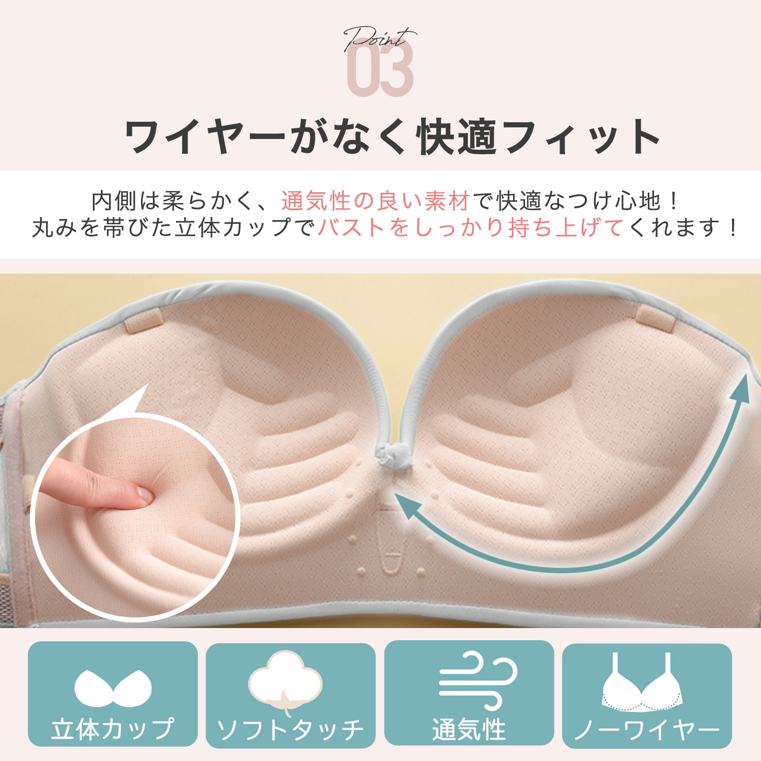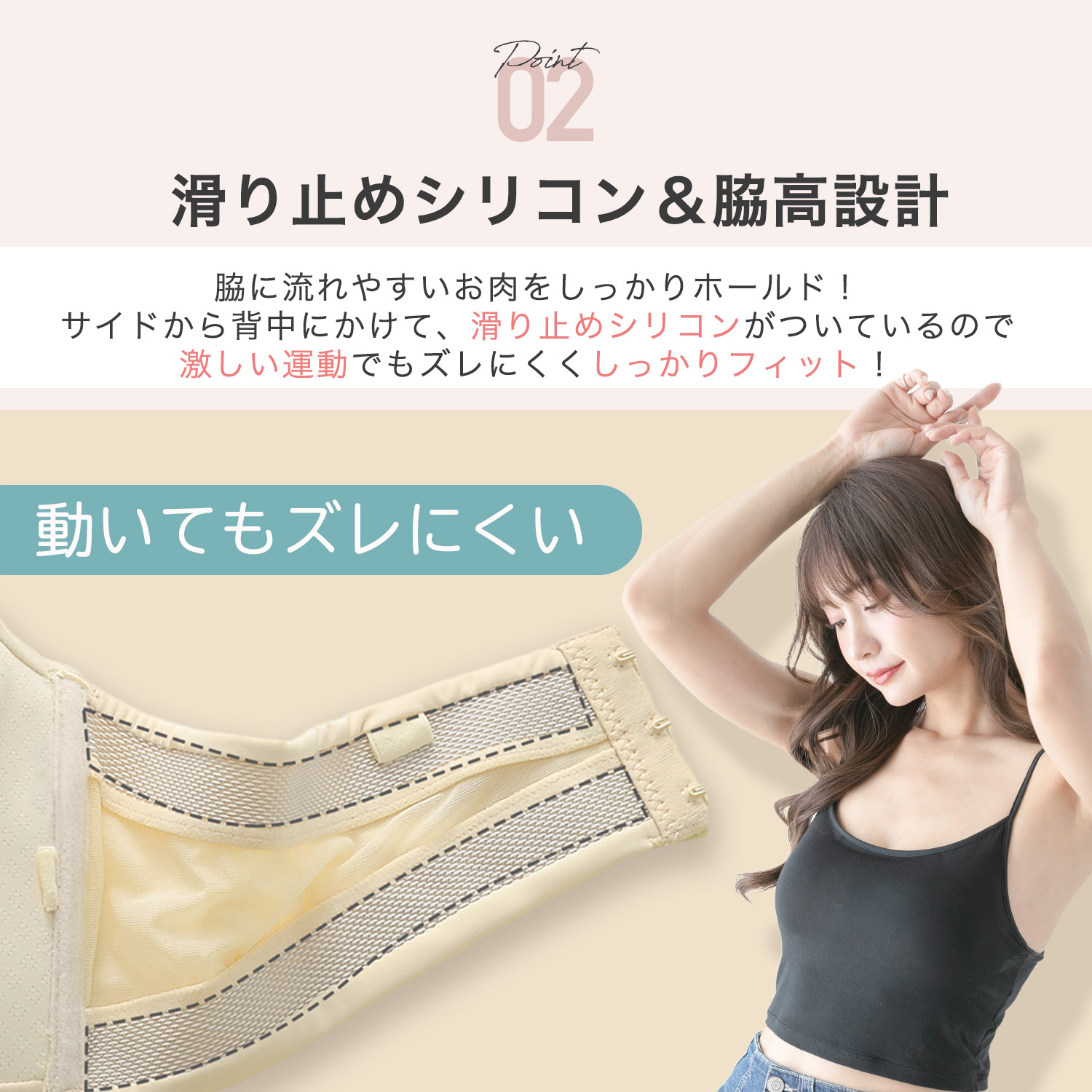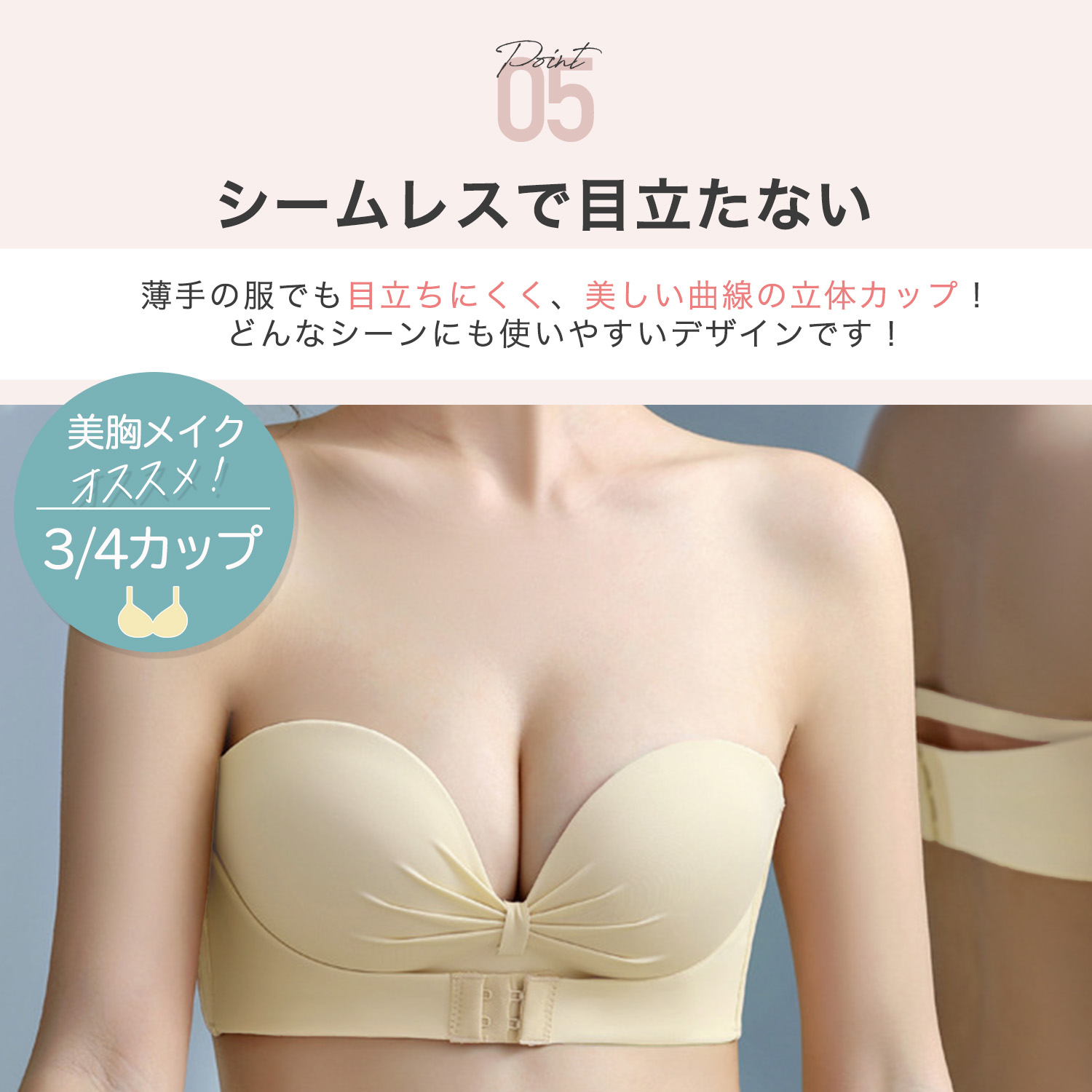 ・ 脇をすっきり見せ、バストを斜め下から中央に寄せることで、美しい谷間に変身