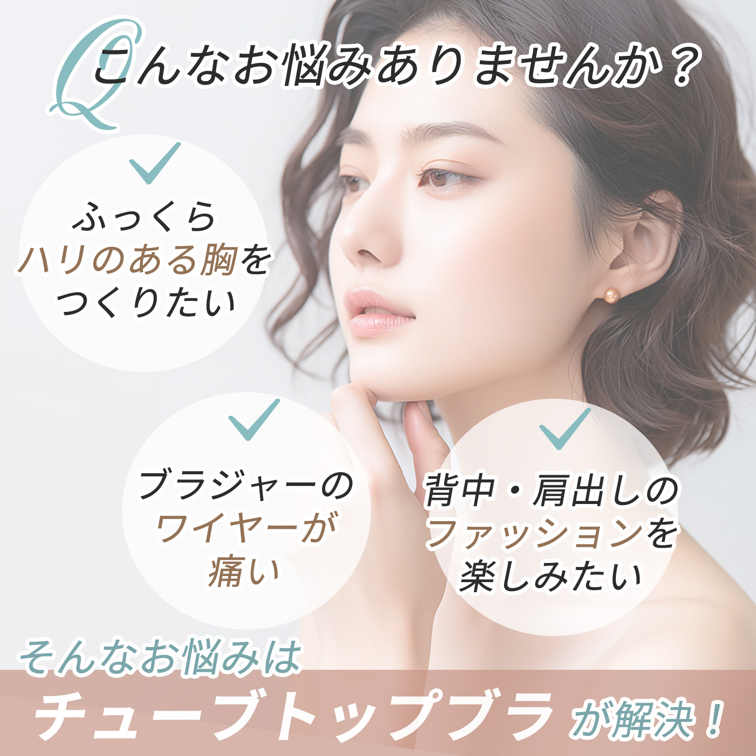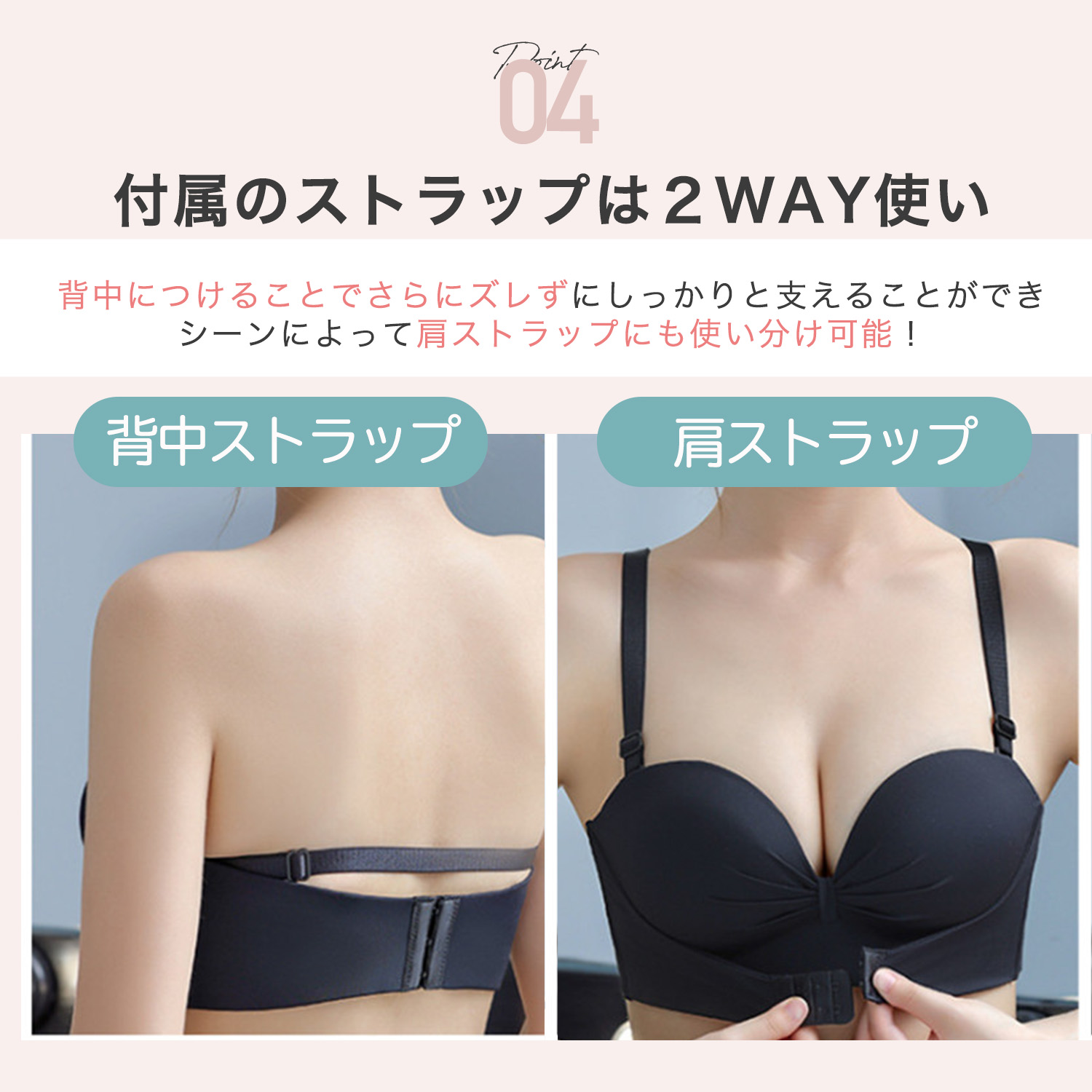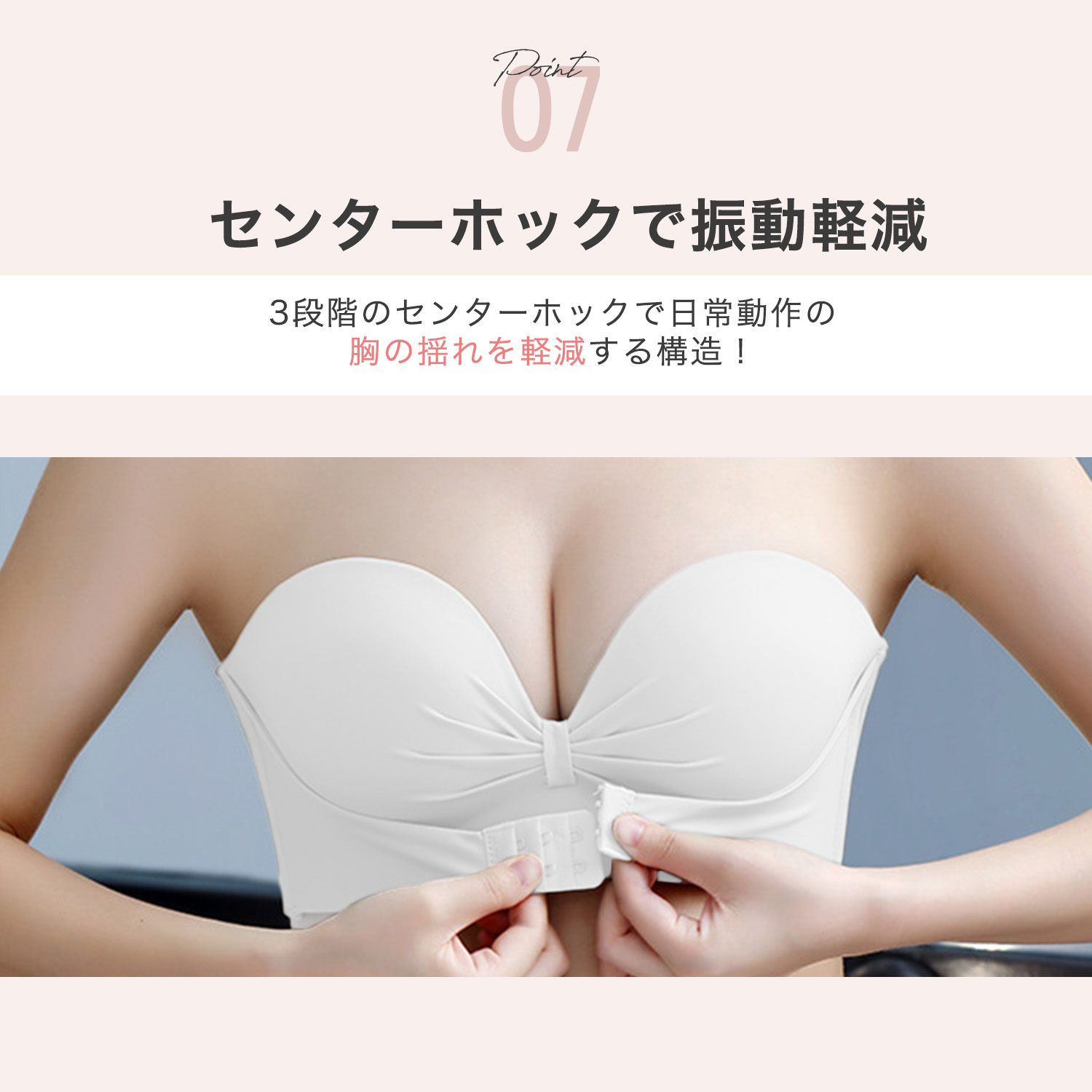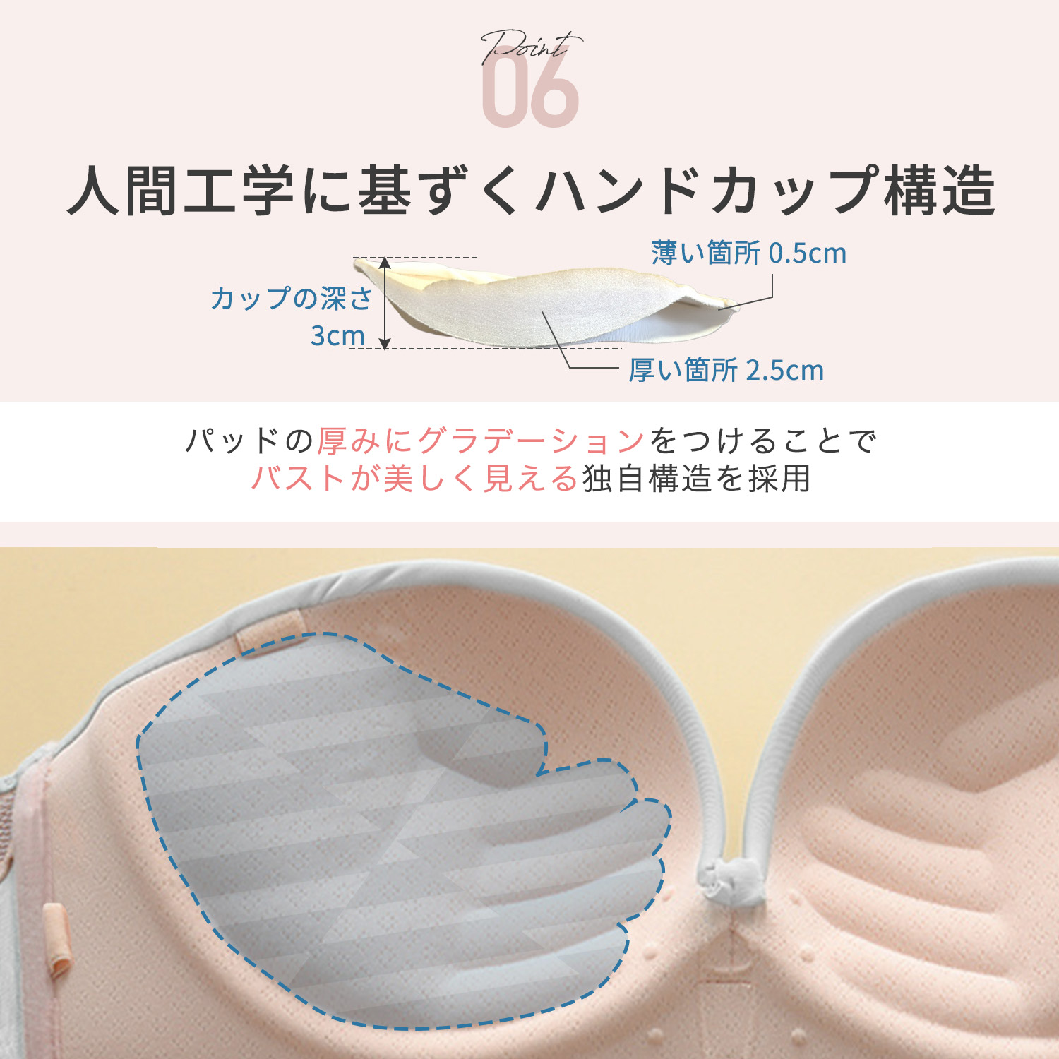 ・ 脇をすっきり見せ、バストを斜め下から中央に寄せることで、美しい谷間に変身