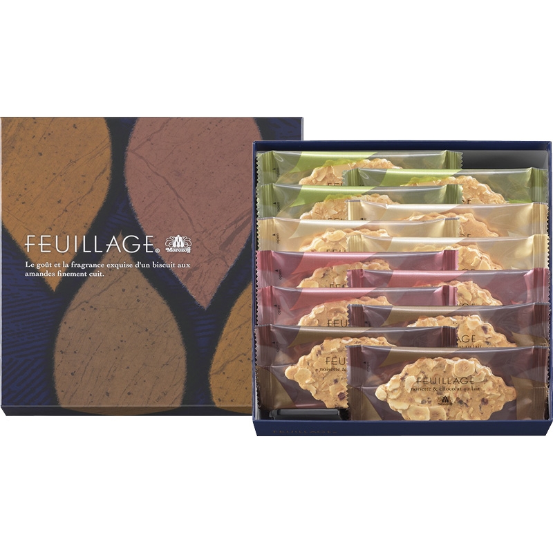 モロゾフ自慢の焼き菓子。スライスナッツをたっぷりとしきつめパリッと香ばしく焼き上げた木の葉型のクッキー。 絶妙なバランスで、チョコレートをサンドしました。