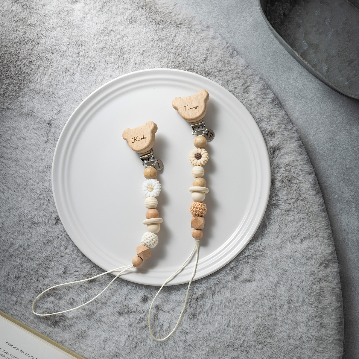 クマさんクリップと、くすみカラーのひまわりがポイントのマルチホルダー/おしゃぶりホルダー/トイホルダーです。meetsではレーザー彫刻での名入れも無料!(※クリップ部分のみ)こちらの商品はスタイや抱っこ紐・ベビーカーなどに取り付けて、おしゃぶりやオモチャなどの落下を防ぐホルダーです。