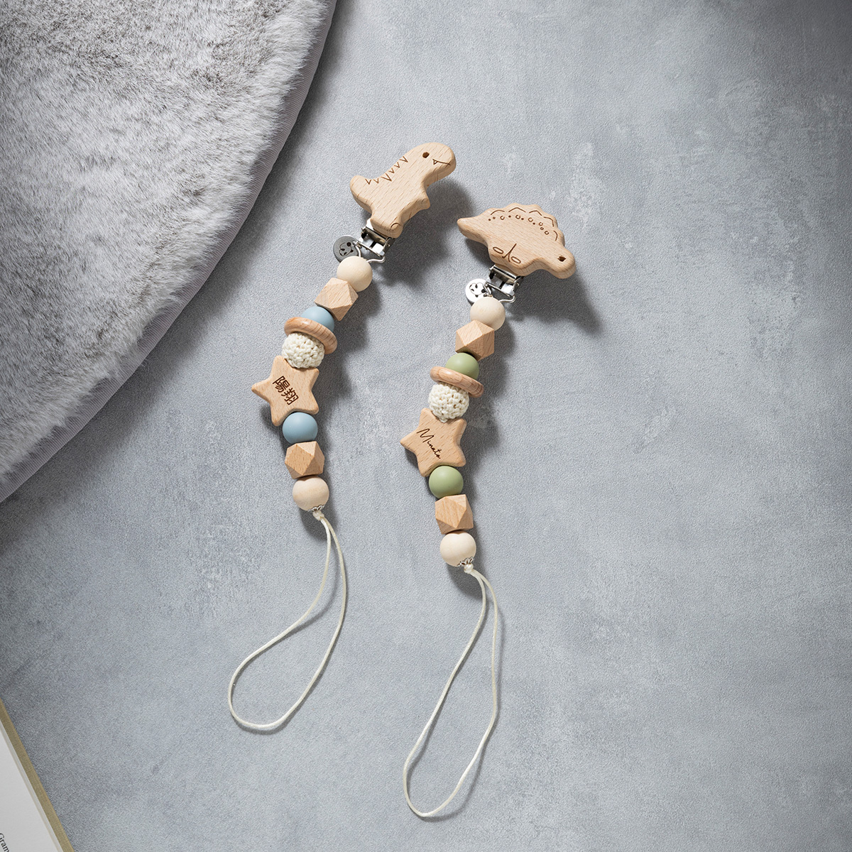 meetsオリジナル恐竜クリップと、星ビーズがポイントのマルチホルダー/おしゃぶりホルダー/トイホルダーです。meetsではレーザー彫刻での名入れも無料!(※星ビーズ部分のみ)こちらの商品はスタイや抱っこ紐・ベビーカーなどに取り付けて、おしゃぶりやオモチャなどの落下を防ぐホルダーです。