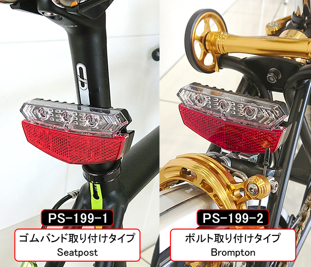 ・リアライト本体は、シートポスト等に固定するゴムバンド取り付けタイプ(PS-199-1)と、Bromptonのリアリフレクター固定部に装着できるボルト取り付けタイプ(PS-199-2)の2つのブラケットタイプから選択可能