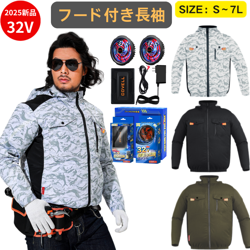 COVELL空調冷風服 2025年新 32V|ファン付き作業服【フード付き長袖、3カラー、S~7L】 空調冷風服 専用充電器付属 ファンバッテリーセット 熱中症対策 プレゼント