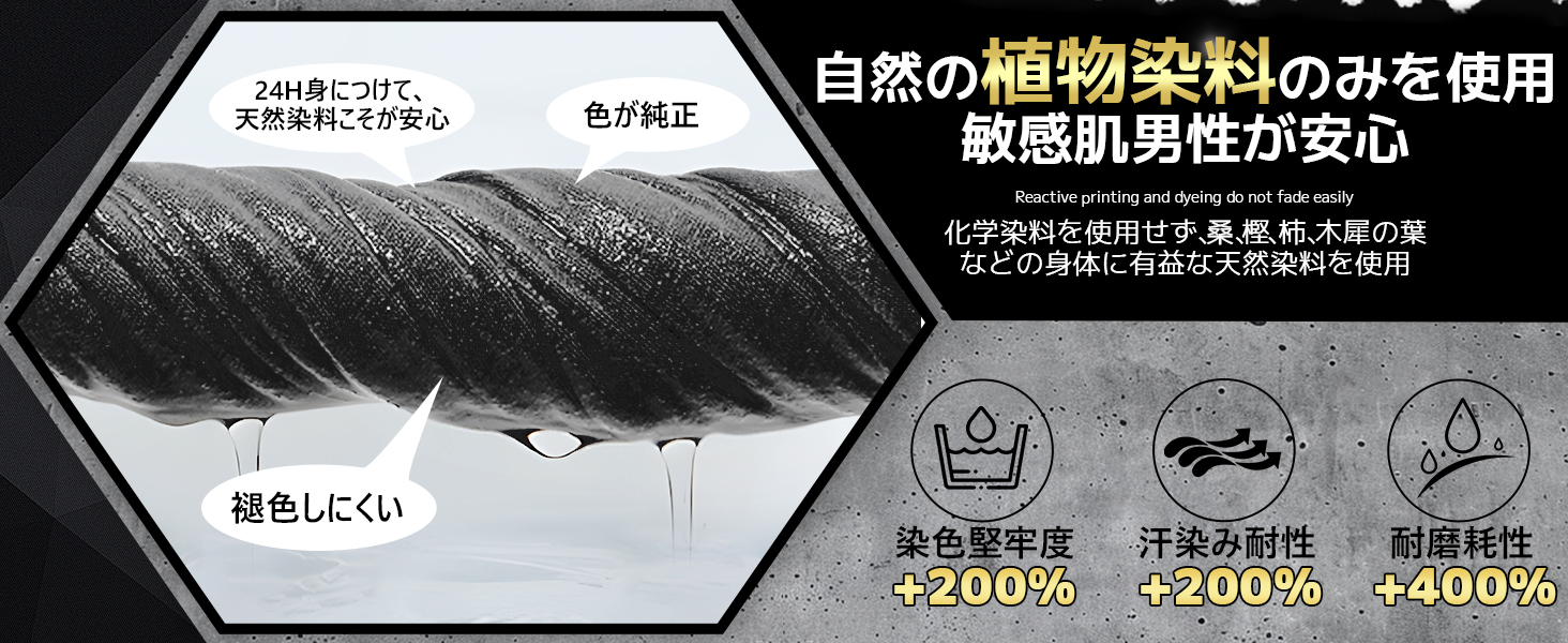 【敏感肌男性が安心】化学染料を使用せず、桑、樫、柿、木犀の葉などの身体に有益な天然の植物性染料のみを使用。カラーは純粋で、色落ちしにくく、化学染料によるアレルギーの心配もない。