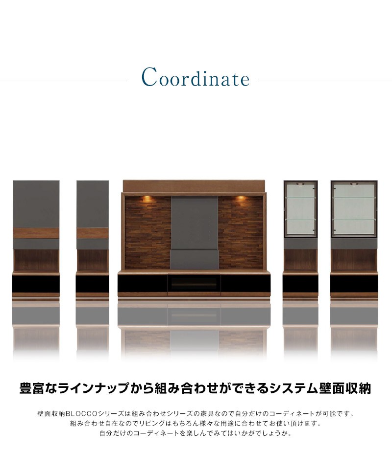 | 商品説明 | 重厚で高級感溢れるウォールナット材を贅沢に使用した、キャビネットBLOCCO。高級感溢れるデザインと計算された収納設計とでごちゃごちゃしがちなテレビ周りをすっきり収納、 普段の生活スペースを「ワンランク上の上質空間」に。 同シリーズとあわせてお使いになると、さらに心地よい統一感に包まれます。 | |