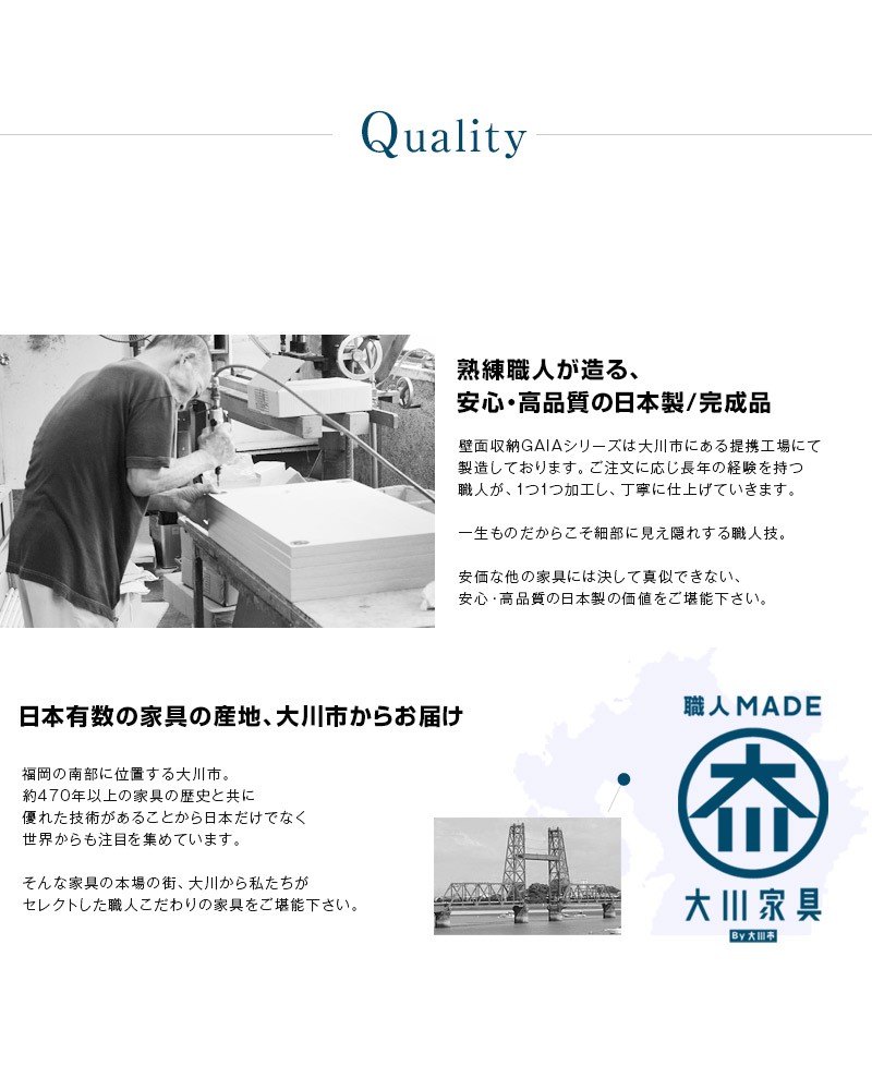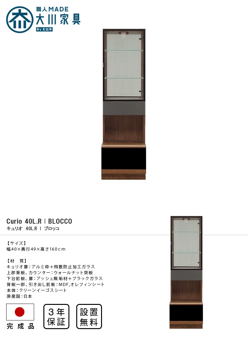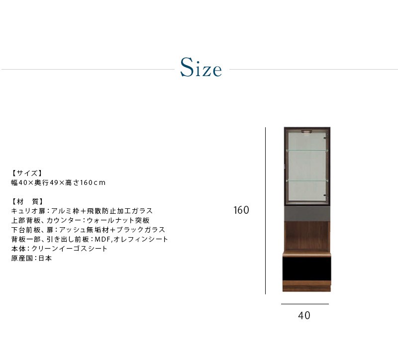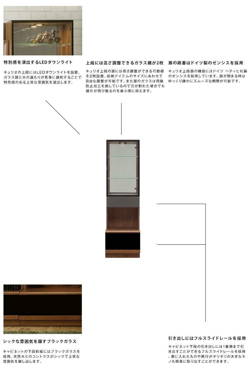 | 材質 | 上部背板…ウォールナット突板 飾り棚、引き出し前板一部…アッシュ無垢材 キュリオ扉…アルミ枠、飛散防止加工ガラス 下台前板、扉…アッシュ無垢材、ブラックガラス 背板無垢部分…チーク無垢材 背板一部、引き出し前板(一部除く)…MDF/オレフィンシート | |