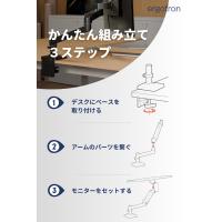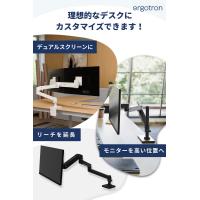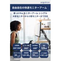・モニターの位置、角度、高さの調整が軽い力で自由自在。好きなところでピタッと止まります。・耐久性に優れ、10年保証です。・豊富なアクセサリで様々なニーズやシーンに対応。デュアルやウォールマウントに変更できます。・台座の回転を180°と360°に変更できます。・従来のLXより軽いモニターを設置できます。1.8-10kgまで、34インチまでのモニターに対応します。・首の上下の傾きは上方向70°/下方向15°で、下方向が従来のLXより10°広がりました。・ケーブルがすっきりまとまり、外観もスマートに。・従来のLXより部品が少なく、モニターの取り付けも簡単になりました。・前後伸縮約65cm、昇降33cm、モニターの縦横回転360°、アーム部分の回転360°、製品本体重量約3.8kg。◆ご注意(免責)>取扱説明書をお読みの上、正しくお使いください。モニターを取り付けてから各部の調整を行ってください。組み立て前の状態では各部の調整はできません。グロメットマウントは別売 (98-728-292) です。◆製品ご購入後のお客様のサポート窓口japansupport@ergotron.com (日本語)ご使用中何かご不明点や不具合がございましたら、こちらのサポート窓口へお問い合わせください。