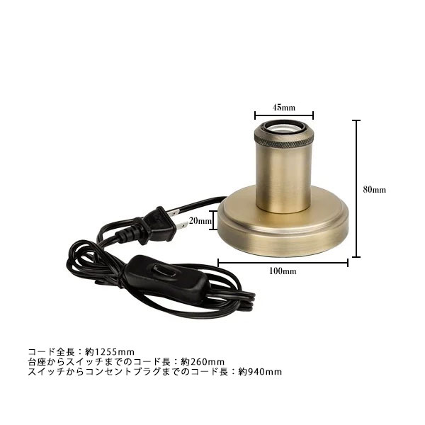 全長:約1255mm 台座からスイッチまでのコード長:約260mm スイッチからコンセントプラグまでのコード長:約940mm |