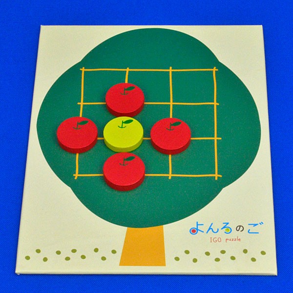 よんろのごは、囲碁界のエース・張栩(ちょうう)棋士が考案した囲碁のルールを使ったパズルです。囲碁盤を大きな木に、白黒の碁石を赤と青のりんごに変えて、頭を使いながら楽しく問題を解いていきます。