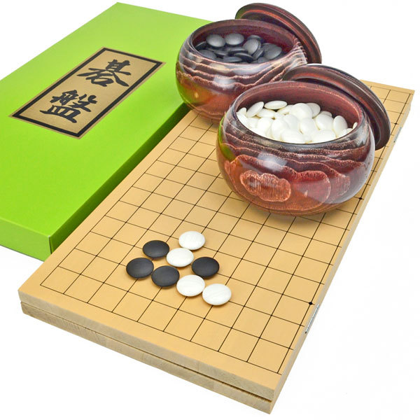 扱い勝手の良い持ち運び性を少し重視した薄めの新桂5号折碁盤と高級蛤碁石と木製碁笥との新桂5号折碁盤セットの中では一番上のランクの囲碁セットです。