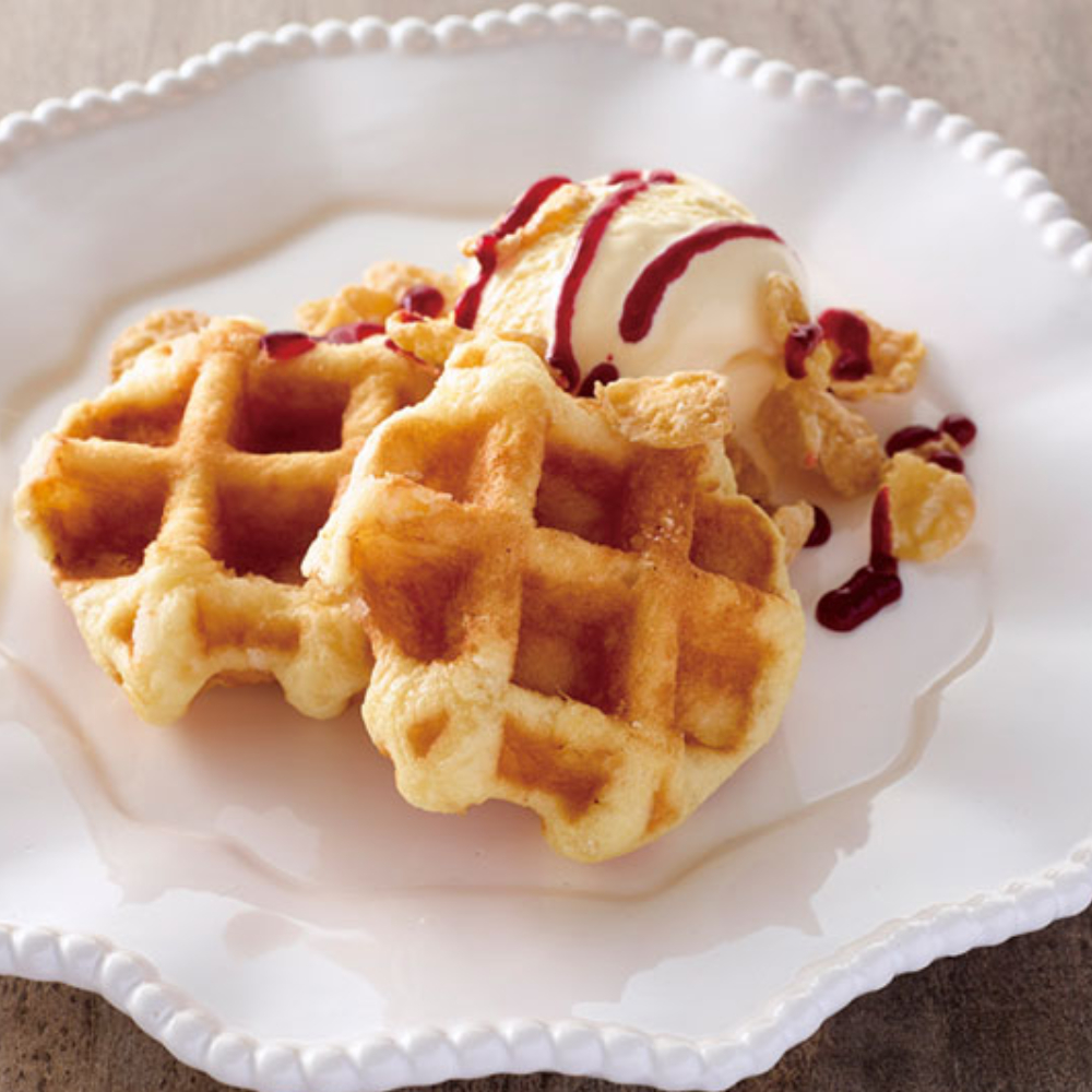 ほんのり甘いベルギーワッフルの生地にパールシュガーを入れて焼き上げました。解凍後、オーブントースターで1-2分焼いていただくと外側がカリッとします。