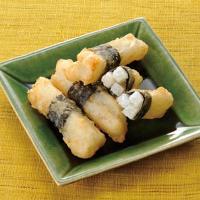 サクサクした山いもを短冊状に切り、のりで巻いて薄衣で仕上げました。