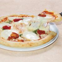 自慢のナポリ風プレミアムクラストにトマトソース、3種のチーズにスモークの香りが特徴のスカモルツァチーズをトッピング。しっかりとしたチーズの味わい。手作りピザの様に自然な焼き色で外はパリッ、中はもちっとした食感が特徴のナポリ風クラストにトマトソース、ナチュラルチーズ、バジルペースト、スカモルツァチーズ、トマト、グラナパダーノパウダーをトッピング。